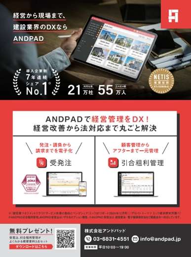 現在、「ANDPAD 受発注」と「ANDPAD 引合粗利管理」の概要をまとめた資料を無料で進呈中。ダウンロードはこちらから。