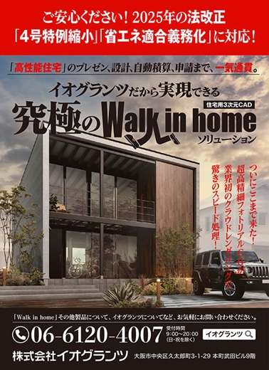 業界最速レベルという住宅用3次元CAD「Walk in home」を展開するイオグランツ(大阪市)は、高性能住宅のプレゼン・積算・設計・申請の全工程で大活躍する同CADを提供する。4号特例縮小・省エネ適合義務化対応の最新バージョンをリリースし、提案を強化している。構造計算オプションで、許容応力度計算もデータ連携で効率化。生産性向上を実現する。リフォーム耐震診断機能も標準搭載している。
