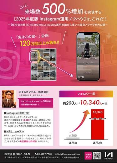 工務店専門のマーケティング支援を行うSHO-SAN(東京都杉並区)は、独自のアルゴリズムによる工務店特化の「Instagramマーケティング」で工務店のインスタ運用を代行する。「来場数500%増加を実現する!」として、住宅会社に特化して200社以上の運用実績から導き出した2025年版のInstagram運用ノウハウを公開。実績に基づいた独自の運用メソッドは、多くの工務店のインスタフォロワーを増加させてきた。
