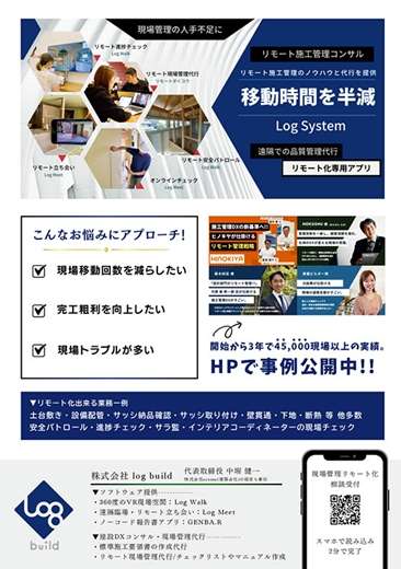 log build(ログビルド、神奈川県横浜市)が提供するリモート施工管理アプリ「Log System(ログシステム)」は、現場の施工品質管理を遠隔で代行する。現場監督の移動時間を大幅に削減し、完工粗利の向上、現場トラブルの防止などにも効果を発揮する。