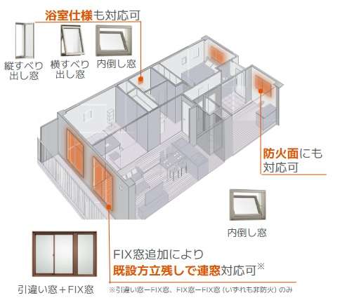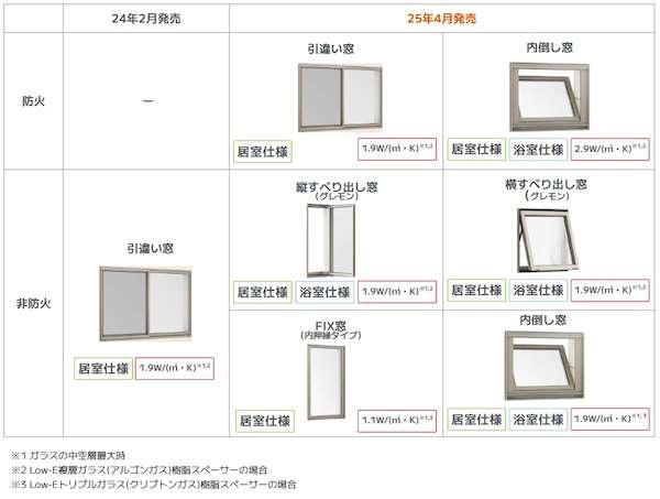 また、非防火の「リプラス マンション用」には、先進的窓リノベ2025事業補助金対象となるAグレード以上の断熱性能を備えたすべり出し窓、FIX窓、内倒し窓などの装飾窓に「居室仕様」と「浴室仕様」を追加した。これにより、浴室の窓リフォームや住戸まるごと窓リフォームに対応できるようになった。