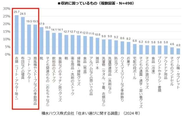 「収納に困っているもの」を聞いたところ、1位に「衣類(コート・アウター除く)」(25.7%)、3 位に「コート・アウター」(19.5%)となり、衣類の収納に困っている人が多く見られた。「布団などの寝具」(24.5%)、「扇風機やストーブなどの季節用品」(19.5%)も上位に。滞在時間が長く物が集まりやすい「リビング」、衣類や布団収納のある「寝室」で収納に対する問題が顕著に現れる結果となった。