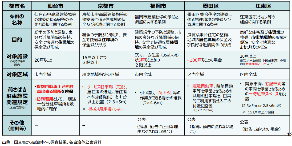 例えば仙台市では、20戸以上の共同住宅を対象に貨物自動車または訪問者用の自動車1台を駐車できる場所を確保することを要請。東京都では13特別区と4政令市で、条例または指導要綱により、荷さばきスペースを1カ所以上設置することを義務付けまたは誘導している。