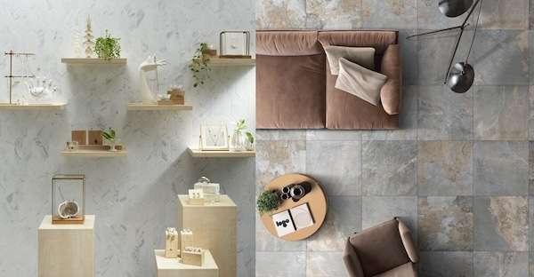マットでグレイッシュな表情にサビ色をきかせたスレート調タイル。内床タイプと外床タイプの2種類。2色。597×597mm。1万2540円/平米(税込)