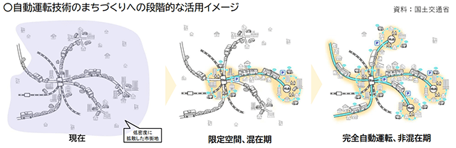 同資料によると、2050年代以降の自動運転が本格実装された社会では、▽公共交通サービスの水準向上▽主要幹線道路・中心市街地の道路混雑の緩和▽運転ミスに起因する交通事故の低減▽駐車場利用の平準化―などのメリットが得ることが期待されている。一方で、居住地の選択や都市構造に影響を与える可能性もある。