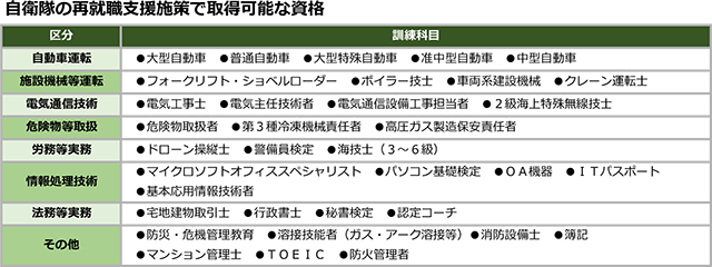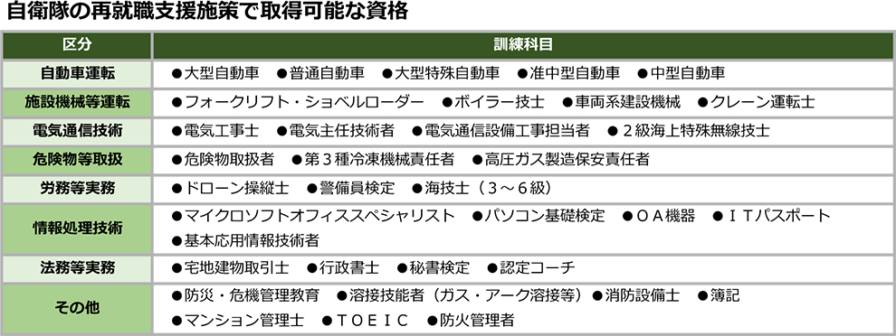 就業時もしくは退職時に隊員が保有・取得可能な資格は、大型特殊自動車・車両系建設機械などの運転資格、電気通信関係資格、危険物取扱者資格など。数としては多くはないが、建築士や測量士などの資格を保有する者もいる。