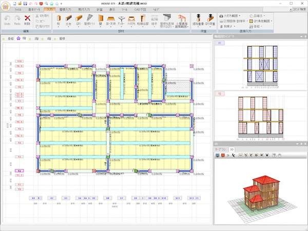 3階建て・2階建て以下の木造軸組工法に加え、RC/S造との立面混構造の木造部分の構造計算が行えるソフトウェア。計算した結果は、伏図などととに構造計算書として出力される。