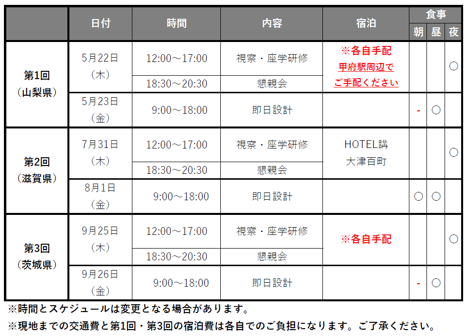 第1回 5月22日(木)・23日(金) 株式会社丸正渡邊工務所[山梨県] 第2回 7月31日(木)・8月1日(金) 株式会社木の家専門店 谷口工務店[滋賀県] ※古民家ホテル「HOTEL講 大津百町」宿泊(料金に含む) 第3回 9月25日(木)・26日(金) 有限会社自然と住まい研究所[茨城県] |