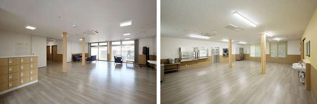 建物は、木造2階建てで延べ床面積2053.50㎡。定員60人で全室個室となっている。エントランスホールや食堂などの柱は木のあらわしとし、温かみのある空間に仕上げた。