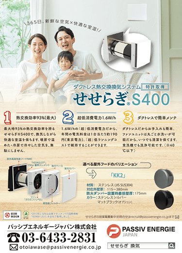 パッシブエネルギージャパン(東京都品川区)は、業界最大値・熱交換率93%のダクトレス熱交換換気システム「せせらぎ」の新バージョン「せせらぎS400」を発売した。給排気が60秒ごとに切り替わる効率的な換気設計で、快適な住環境を実現する。