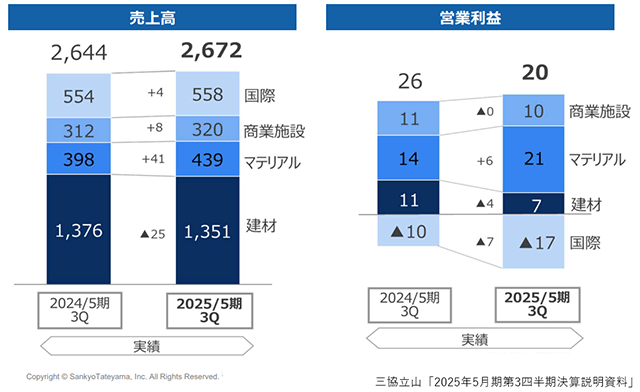 三協立山(富山県高岡市)が4月3日発表した2025年5月期第3四半期決算は、売上高が前年同期比1.1%増の2672億9900万円、営業利益は同23.1%減の20億4500万円、経常利益は同47.1%減の14億9300万円となった。売上増はマテリアル事業の好調や海外事業での為替差益などによるもの。その一方で価格改定などの収益改善策が奏功せず、最終損益は4億1300万円の赤字となった。