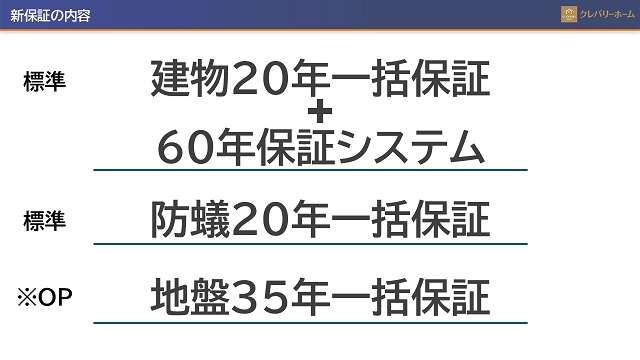 クレバリー・ホームワランティは、同社規定仕様の木造戸建て住宅を対象に、建物(構造・防水)および防蟻について標準で20年の初期長期保証を提供。家の骨組みや雨漏りなどを保証するほか、白アリの予防工事・定期点検を実施し、被害が出た際にも対応する。地盤には「選択式」のオプション保証(最長35年)を用意し、地盤のゆるみや液状化、擁壁のトラブル、地震による建替えにも対応する。