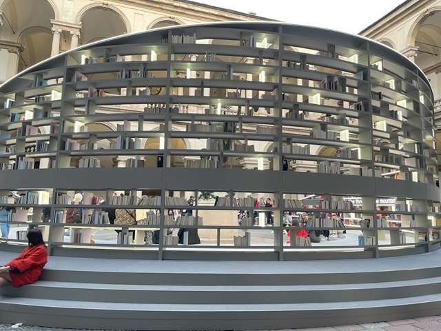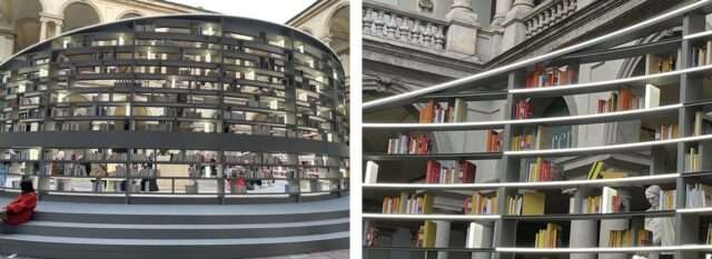 サローネとブレラ美術館とのコラボ、「光の図書館」(エス・デブリンとの協業)。光り輝く円形の書棚には2000冊の蔵書が収められ、ゆっくり回転している