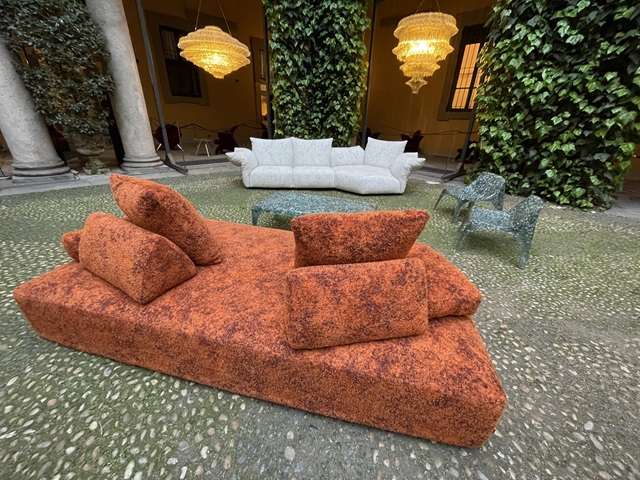 B&B・MAXALTOの並びにエドラのショールーム「PARAZZO Durini」があります。1階の前庭に新作のアウトドア家具が置かれています。エドラらしい明るい色彩です。