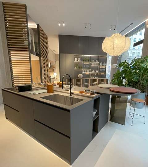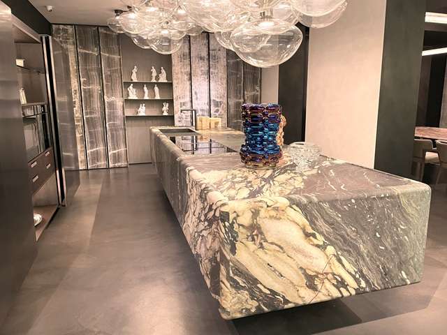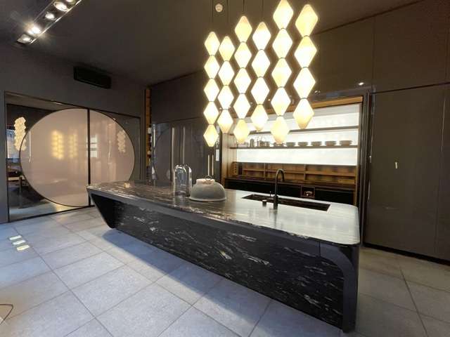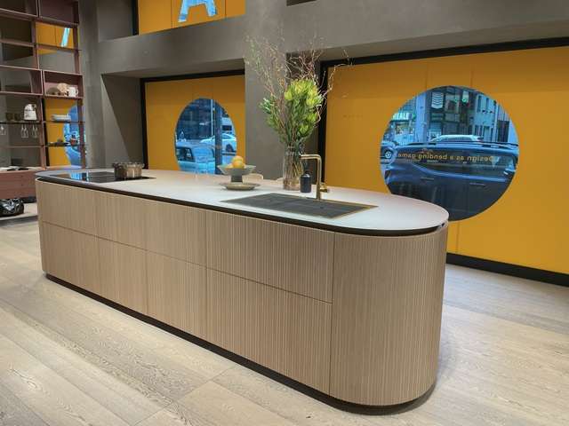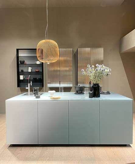 カーブのある縦リブキッチン扉が特徴のアイランドキッチンは2024年に発表され注目を浴びたもの。昨年、プロトタイプで鳥がプリントされていたキッチンは美しいグラデーションのブルーガラス扉にチェンジされていた