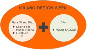 Fiera Milano, Rho(ローフィエラ:≒170,000㎡)での見本市と市内各所のショールームやギャラリー、イベント会場を使ってのFuoriSalone(フォーリサローネ)、双方をまとめての呼称です。