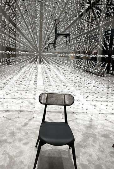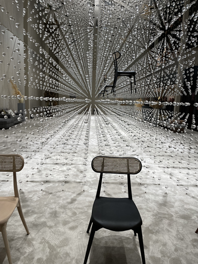 1万個のアクリルが新作のチェアを囲んで、光と音の演出で来場者を魅了しました。DRAFT about DRAFTの展示(写真下)。