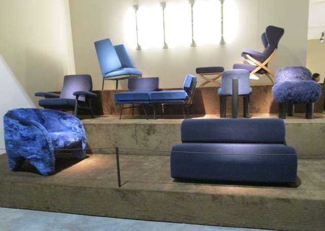 Arflex(アルフレックス)/アーカイブの家具を階段状に展示。アクセントカラーのブルーも目に留まります