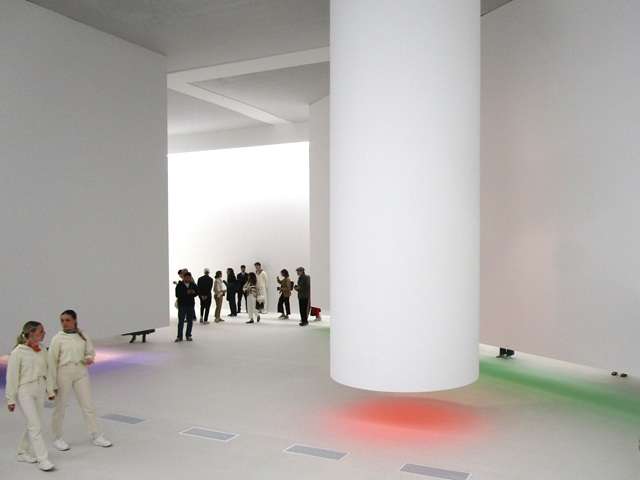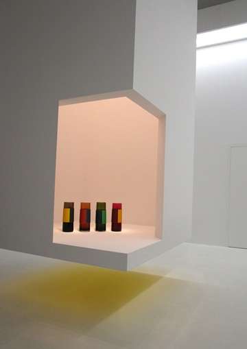 洗練された美意識が会場を包み込む。天井から下がる真っ白な円・三角・方形の筒、エルメスの様々なオブジェが納められ、美しいカラーの光が床面に投影されている