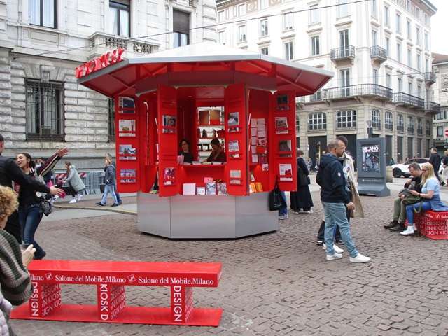 スカラ座前広場のデザイン・キオスク。ミラノサローネの運営、多くの人で賑わっています