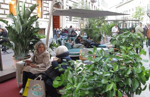 ドゥリーニ通りにはグリーンが各所に置かれ心地よい。カッシーナSRの前にはOUTドアリビングが出現