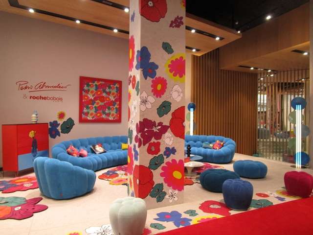 今年2年目になる新ショールーム内。一歩足を踏み入れるとロッシュボボワの《Art de Vivre》を最高のパフォーマンスで表現した空間が飛び込んでくる。ワクワク・ドキドキする空間を楽しんでほしいとのデザイナーの願いが込められたカラー・パターンからエネルギッシュなパワーが溢れ出ています