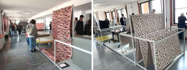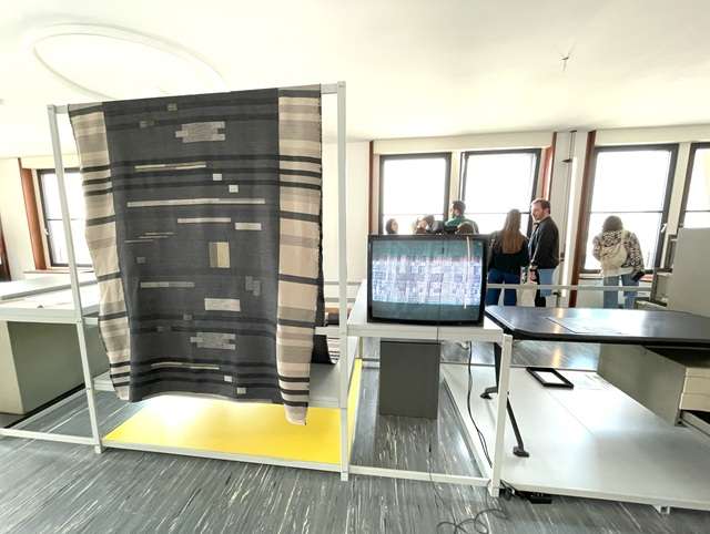 《Weaving Anni Albers》展。20世紀を代表するテキスタイルデザイナーアンニ・アルバース。DEDARが製作したアイコニックな5つのファブリックスを最新の技術で再現した。モダニズムを象徴するベラスカタワー(1958年)が会場とあって連日大盛況だった