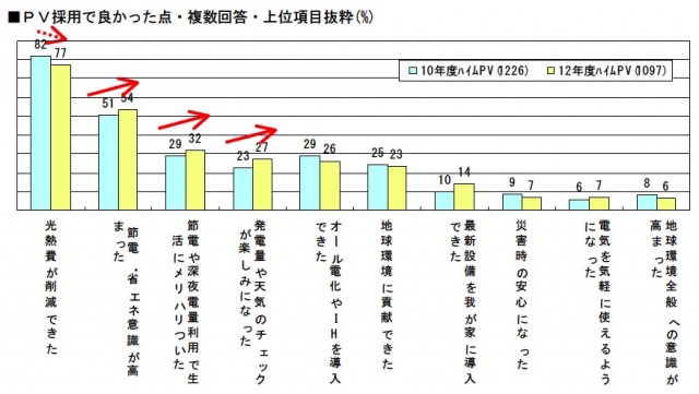 採用して良かった点については、「光熱費が削減できた」77%が断トツでトップに。ただし、2年前の調査に比べると5ポイント低下。一方で「節電・省エネ意識が高まった」54%(2010年度:51%)、「節電や深夜電力利用で生活にメリハリがついた」32%(同:29%)、「発電量や天気のチェックが楽しみになった」27%(同:23%)など意識に変化があらわれ、節電・省エネを楽しみながら行っている人が増えているとした。