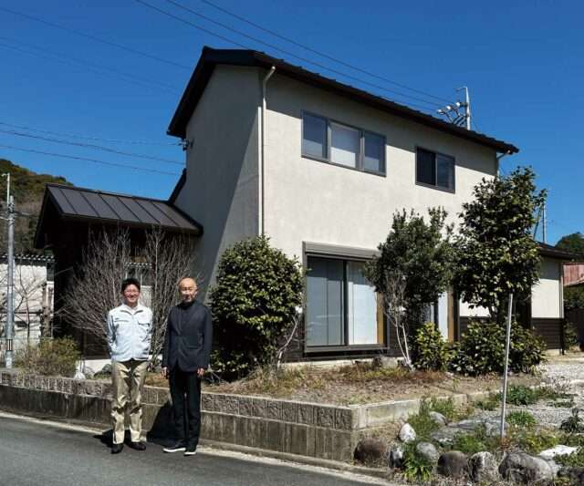完成した二俣リノベーションモデルハウス。三立木材社長の河島由典さん(左)と筆者