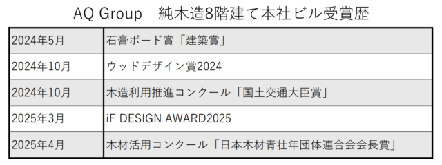 AQ Group純木造8階建て本社ビル(木材活用コンクール日本木材青壮年団体連合会長賞受賞)
