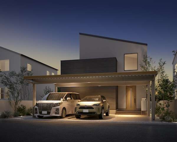 「カーポートSC」は、様々な住宅に調和するよう構造・素材・質感にこだわり、雨樋を屋根・柱に内蔵してネジやボルトが屋根下から見えないノイズレスデザインが特徴。