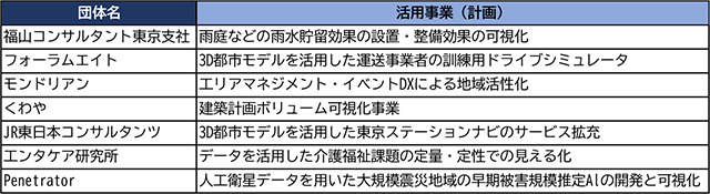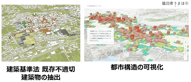 地方自治体向けの事業では、福岡県うきは市の3D都市モデル事業などが採択された。同市では、3D都市モデルを伝統的建造物群保存地区など(現都市計画区域外)の建築基準法既存不適格調査に活用。調査結果を3D都市モデルとして可視化し、都市計画マスタープランや建築基準法緩和条例の検討資料として用いる。