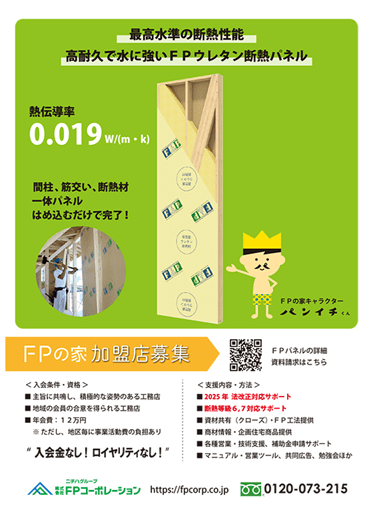 同ネットワークでは、このFPウレタン断熱パネルをはじめとした資材供給やFP工法の提供、営業ツール、共同広告、各種補助金申請支援などのほか、今年4月の法改正対応サポートや断熱等級6、7対応へのサポートも行う。全国ネットワークによる幅広い情報力や、広報活動により、加盟各社は営業や技術・知識のレベルアップが可能。