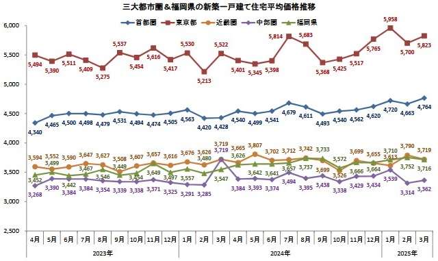 中部圏(4県)は、前月比1.4%増の3362万円と上昇に転じたが、前年同月比は2024年3月が集計開始以降最高価格だったため、大きくマイナスとなった。愛知県は3532万円(1.5%増)と反転上昇したものの、前年同月比はマイナスの水準が続く。名古屋市は4082万円(1.6%減)と2カ月連続で下落した。