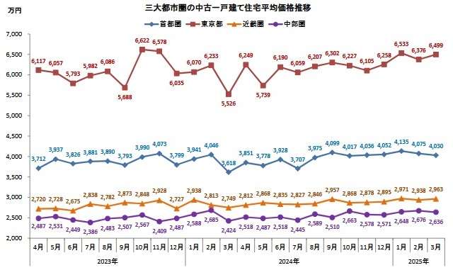 首都圏の中古一戸建ての平均価格は、前月比1.1%減の4030万円と2カ月連続下落したが、4000万円台を維持。前年同月比は2ケタ増と高い水準を示している。東京都は6499万円(1.9%増)と反転上昇。前年同月比は築年数が1.8年若返っていることもあり、17.6%増と大きくプラスとなった。