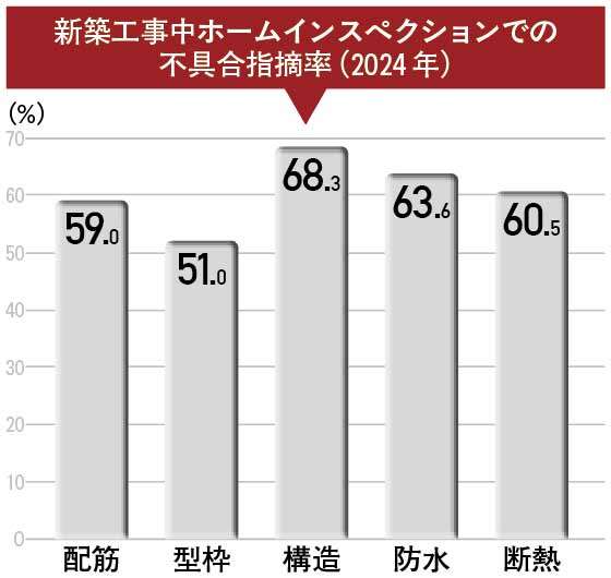 個人向けホームインスペクションを行うさくら事務所が、2024年に実施した新築工事中ホームインスペクションの検査結果を集計したところ、全ての検査項目で不具合の指摘率が50%を超えた。防水や断熱は6割、構造に至っては7割近い指摘率に。いずれの項目でも、以前から指摘されることの多かった不具合が今でも目立つ。【編集長 荒井隆大】