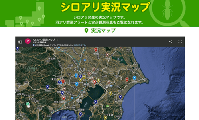 ヤマトシロアリが巣別れのために羽アリとなって飛び立つ群飛(スウォーム)の時期に合わせて作成したもので、同サイト内では群飛状況を知らせる「羽アリ群飛アラート」と各地のシロアリの状況が分かる「定点観測写真」も掲載している。