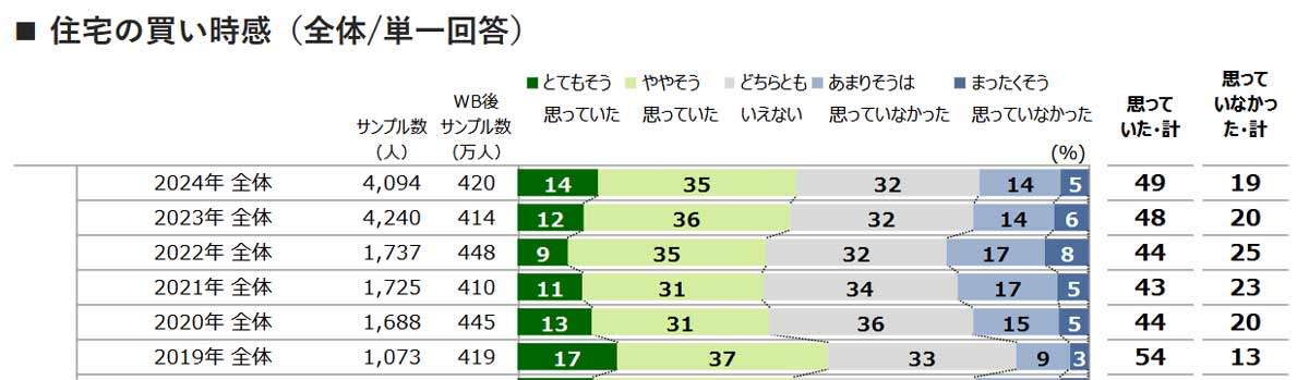SUUMOリサーチセンター(東京都千代田区)は、2024年「住宅購入・建築検討者調査」の結果をまとめた。2024年に住宅を購入・検討した人で「買い時だと思っていた」のは49%に達し、3年連続で上昇した。買い時だと思った理由では「これからは住宅価格が上昇しそう」が46%で最も高かった。