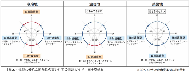 ①「季節・方位・時間に応じて日射が調整できる設計」では、室内に入った熱を“逃がさない”方法について説明。開口部・開口部材および軒・庇(ひさし)と日射遮へい部材の組合せなどによる日射調整の事例を取り上げている。