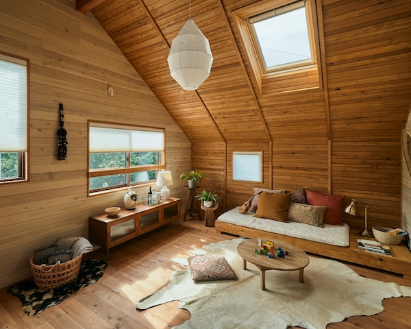 「間貫けのハコ」は、幅3.5mの広い間口と国産杉に囲まれたおおらかな室内空間が特徴。