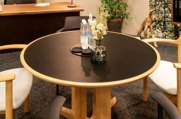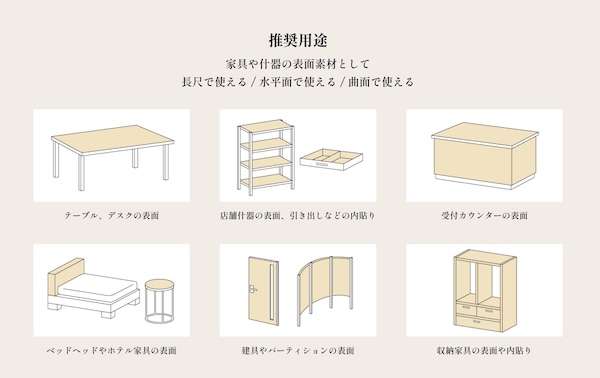 革製品のようなさわり心地と香りが特徴で、家具や什器、建具の表面材として使用することができる。
