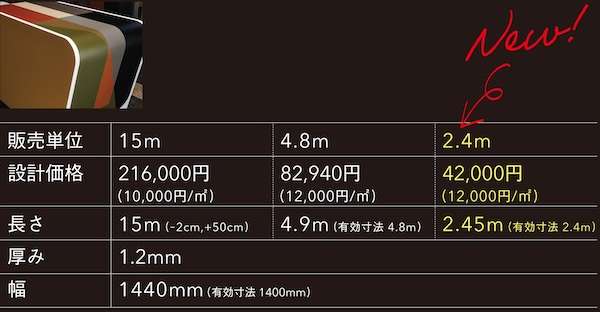 これまでは15mと4.8mの2サイズ展開だったが、テーブル天板などを製作する際に余りが出るため、ユーザーからは「もう少し小さいサイズがほしい」との要望があった。これに応えて4×8サイズに近い扱いやすい新サイズ(2450×1440×1.2mm)をラインアップした。