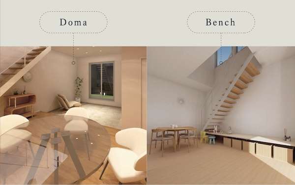 1Fは玄関をなくした「Doma/Bench」✕「オープン/クローズキッチン」の4パターンの組み合わせから選べる。
