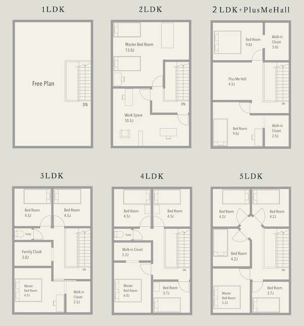 間取りは1LDK〜5LDK+Freeの6パターン。可動式間仕切りの導入により、ライフスタイルの変化に応じて間取りを変更することができる。