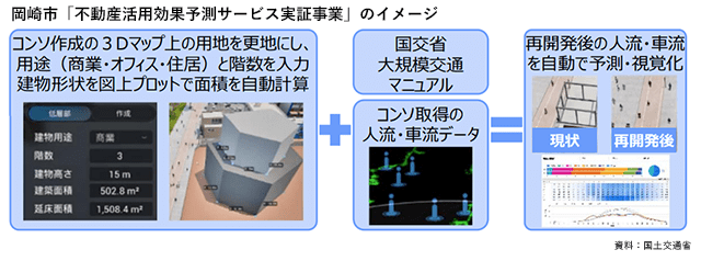 ④「不動産活用効果予測サービス実証事業」(岡崎市)では、コンパクトシティ実現に向けた都市構造再編の前段階として、再開発現場で不動産の活用効果を予測するサービスを構築。建築条件と現状データから完成後の人流や車流を自動で予測、3D視覚化し、不動産事業者などに有償で提供する。これにより視覚化のコストダウンを図り、「街区選定」「テナント誘致」などへの用途拡大を目指す。