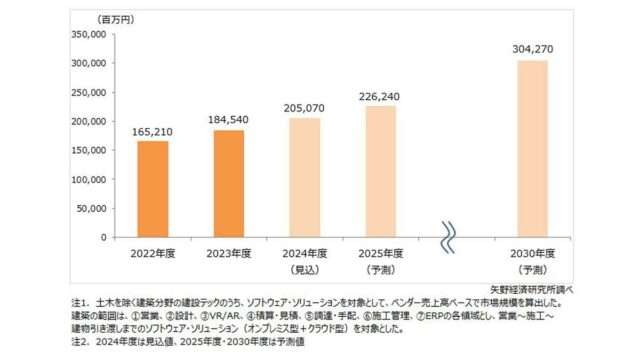 矢野経済研究所(東京都中野区)は4月17日、建築分野の建設テック市場調査の結果を公表した。2023年度の市場規模は、前年度比11.7%増の1845億4000万円と推計。30年度には23年度比64.9%増の3042億7000万円まで拡大すると予測した。