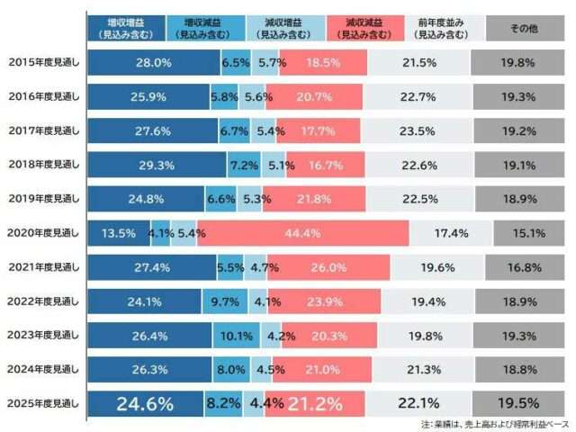帝国データバンク(東京都港区)は、2025年度の業績見通しに関するアンケートを、全国2万6674社を対象に実施した。25年度に増収増益を見込む企業の割合は24.6%となり、2年連続で減少。減収減益は21.2%で、微増ながら2年連続で増加した。