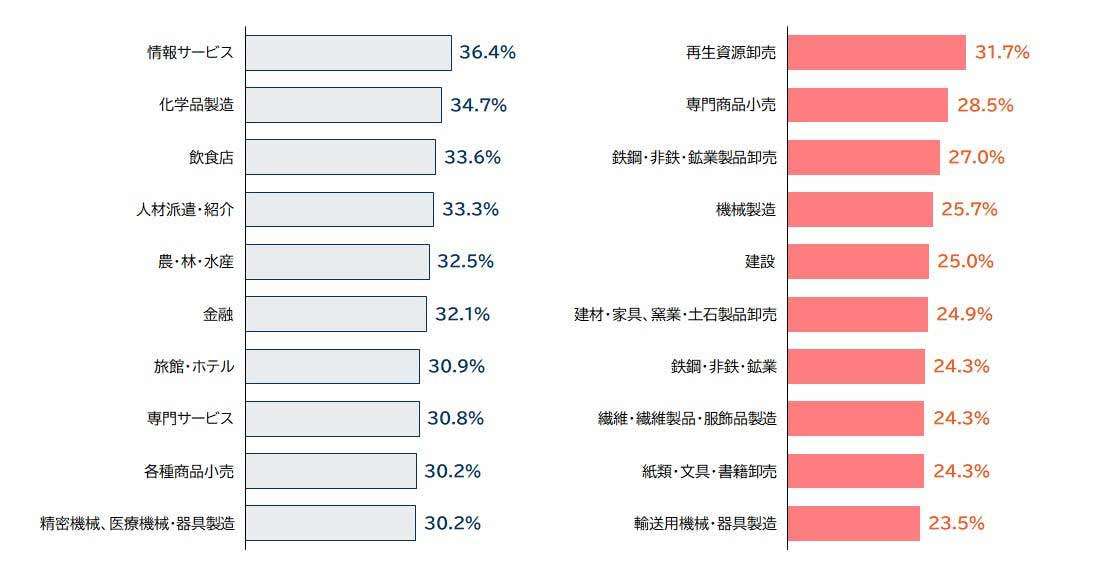 一方、増収増益を見込む割合が最も高いのは情報・サービスの36.4%。次いで化学品製造(34.7%)、飲食店(33.6%)、人材派遣・紹介(33.3%)、農・林・水産(32.5%)という結果になった。