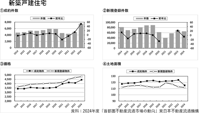 東日本不動産流通機構が4月18日公表した2024年度(24年4月~25年3月)の「首都圏不動産流通市場の動向」(PDF)によると、首都圏(1都3県)住宅市場は、新築戸建住宅の成約件数が前年度比51.3%増の7490件となり、2年連続で前年度を上回った。成約物件価格の平均は4439万円で同8.9%上昇。2021年度以降、上昇が続いている。