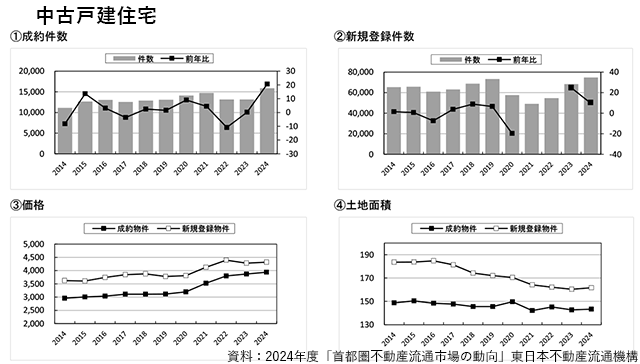 中古戸建住宅は、成約件数が前年比20.6%増の1万5869件となり、2年連続の増加。すべての都県・地域で2ケタの大幅増となっている。成約物件価格は、平均で3939万円(同1.7%上昇)となり、6年連続で上昇。平均土地面積は143.31㎡(同0.4%拡大)、建物面積は103.98㎡(同0.1%拡大)とともに拡大。平均築年数は22.89年で、3年連続で経年化が進んでいる。新規登録件数は7万4791件(同9.4%増)。中でも神奈川県での増加が目立った。価格平均は4316万円で同0.8%の上昇となった。